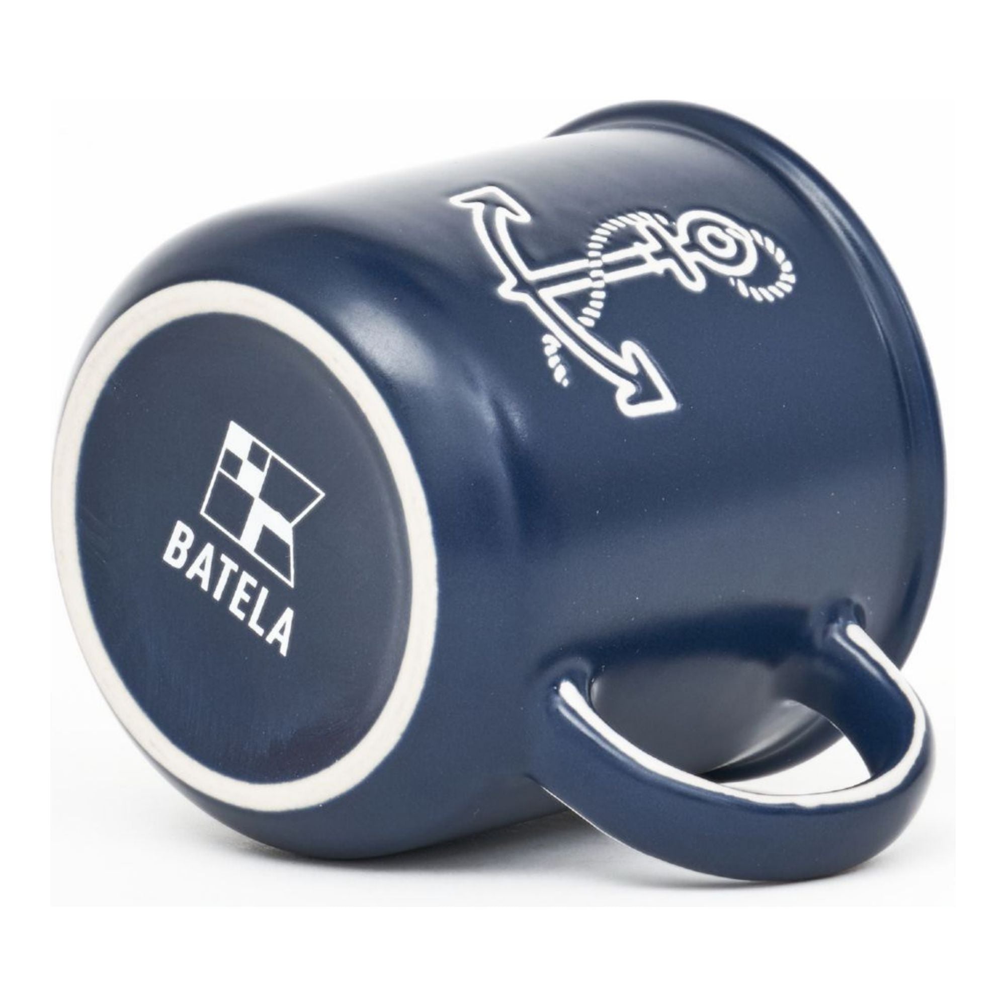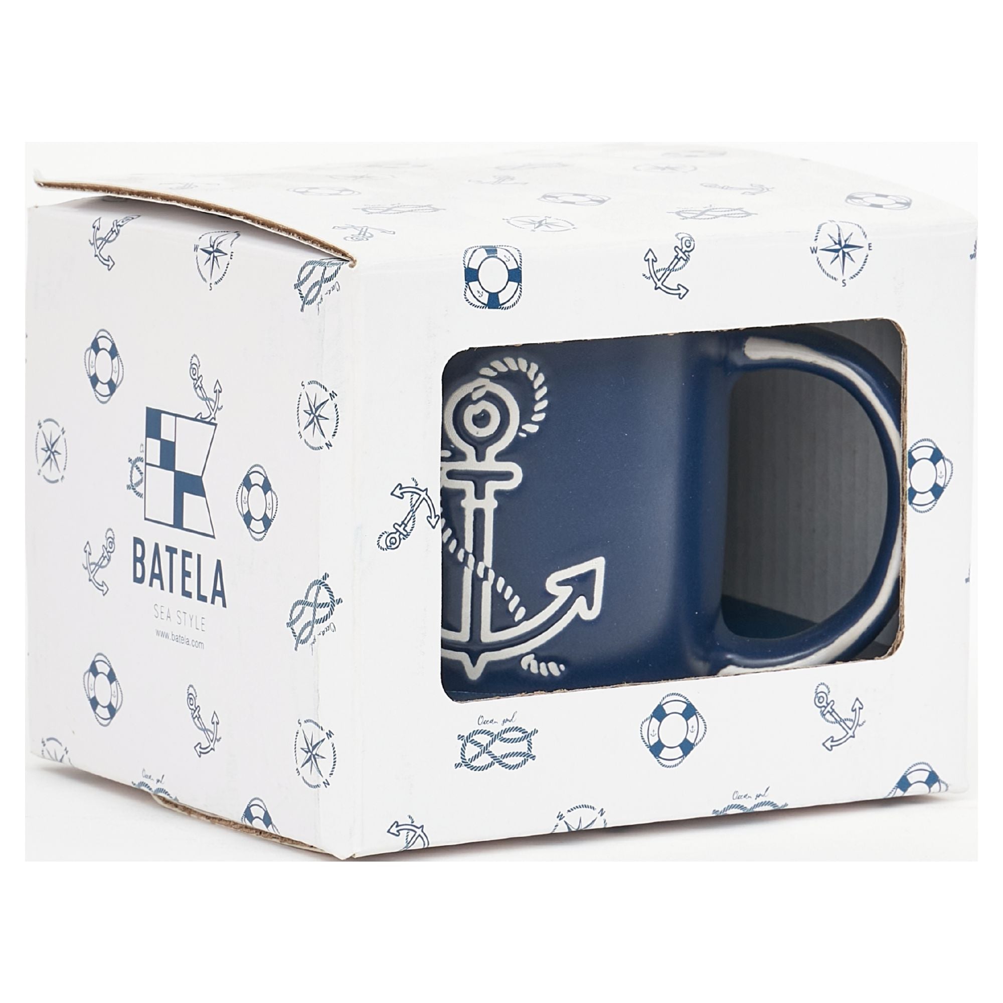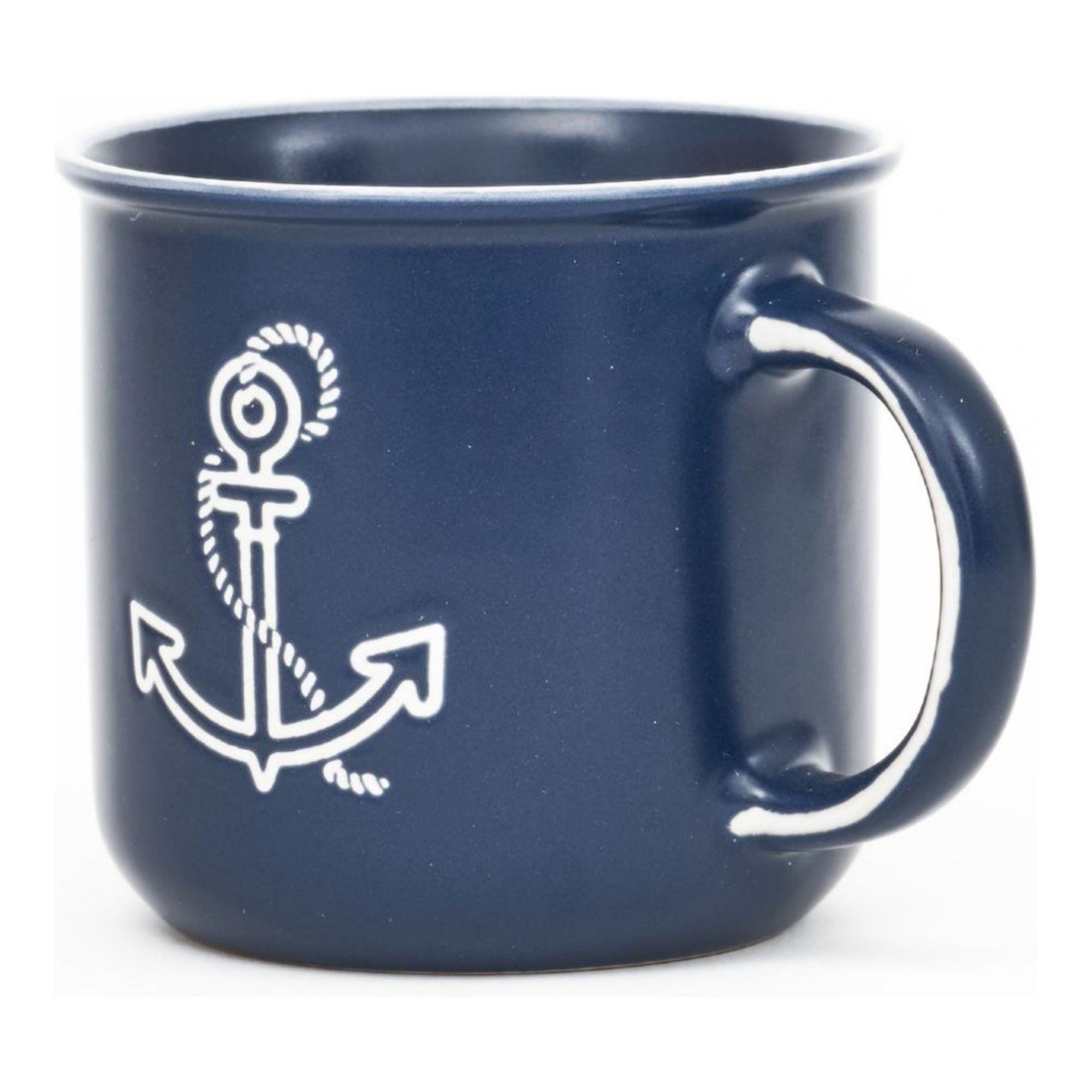 Boxed navy ceramic mug; dishwasher and microwave safe.