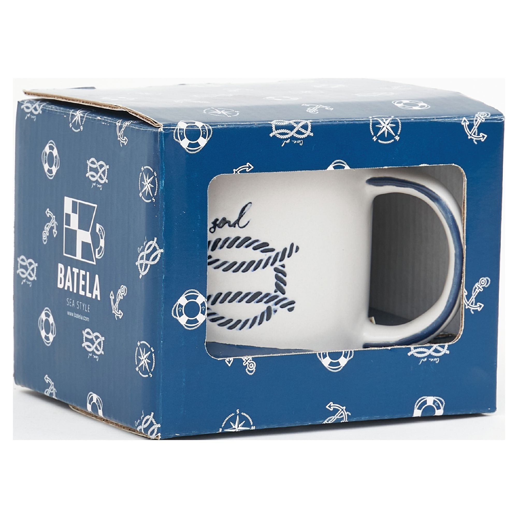 Boxed white ceramic mug; dishwasher and microwave safe.