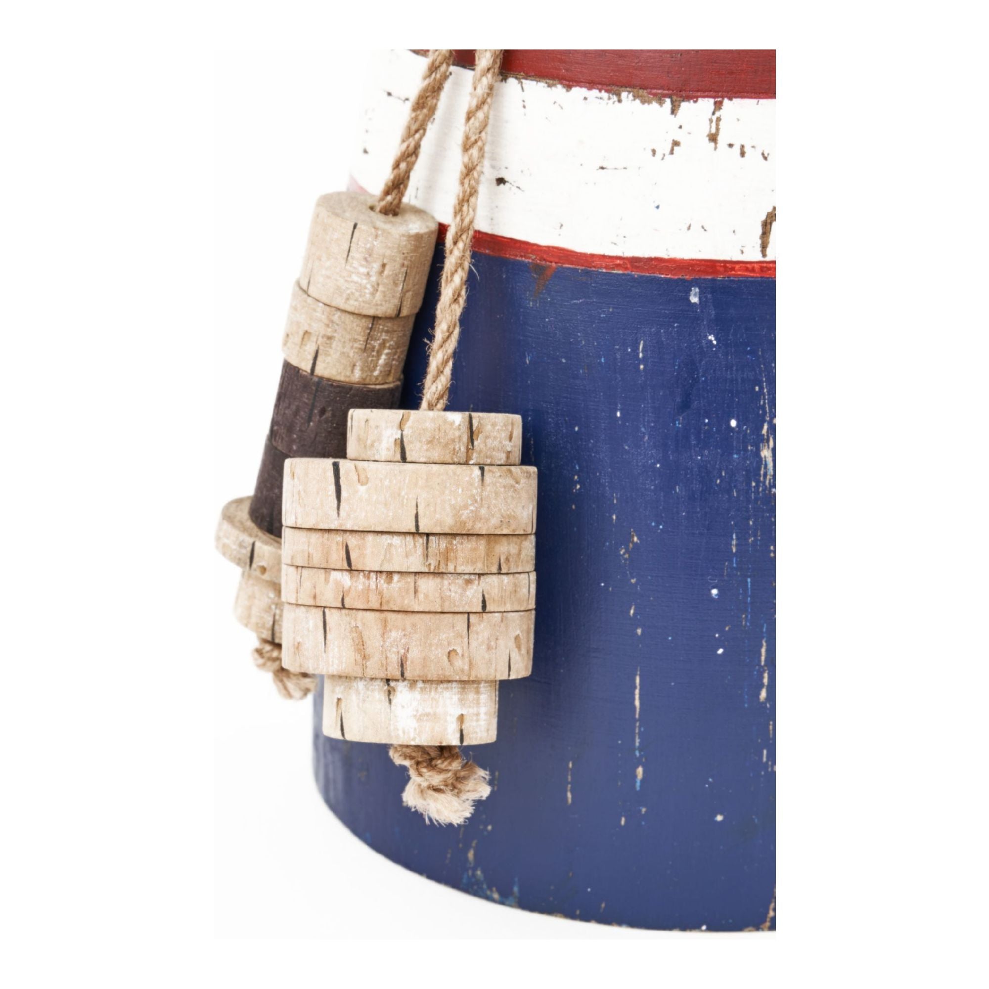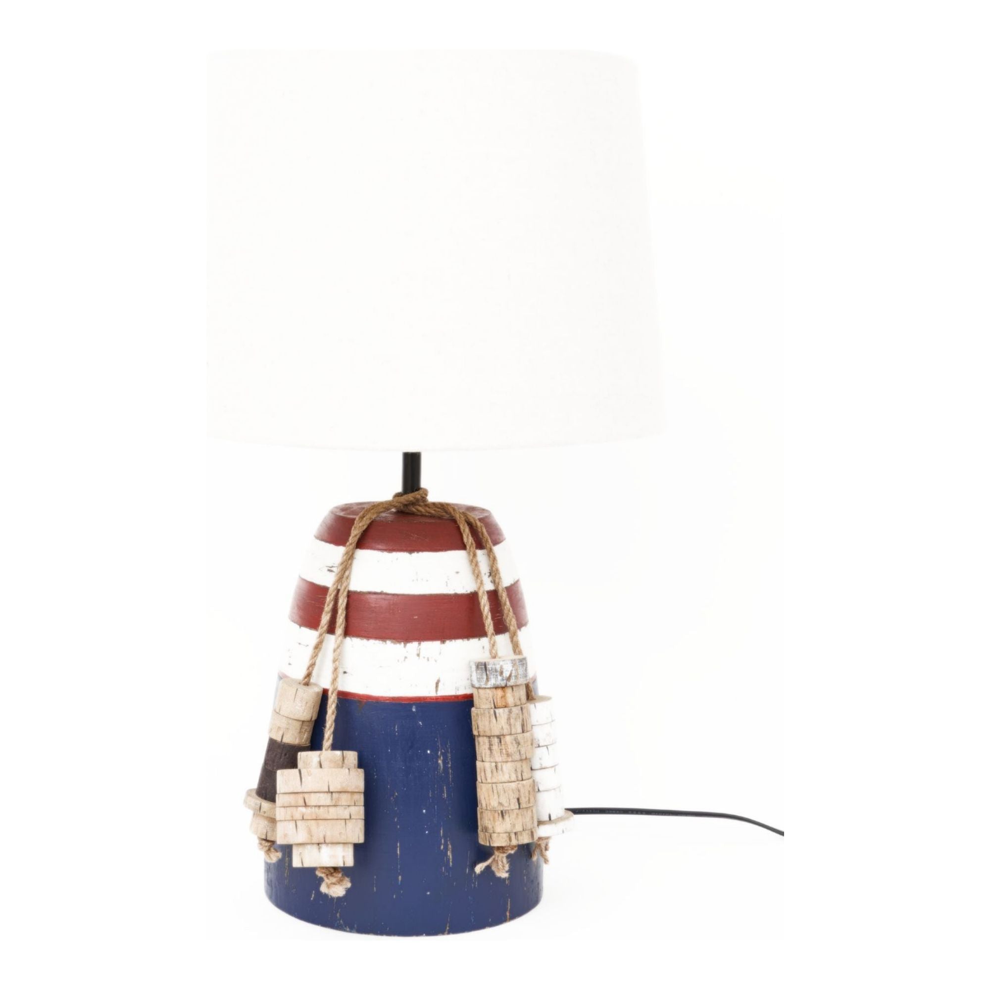 Wooden table lamp in the shape of a buoy complete with hanging floats on the base. Lamp base is painted blue and top part has a red/cream stripe. Delivered complete with iamp shade.