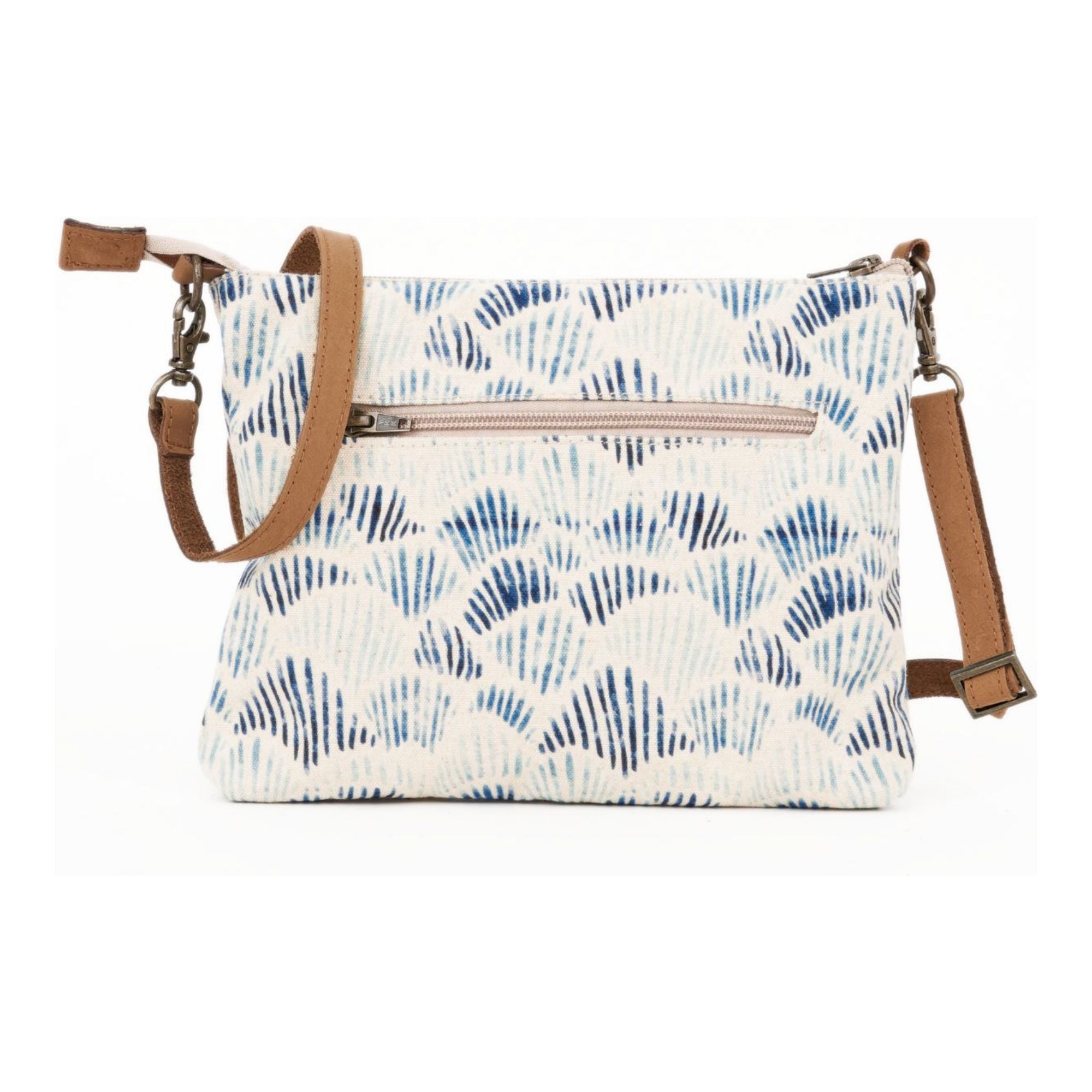 A very practical cotton canvas shoulder bag with a blue 'Shells' design and single leather strap. It has a zip top.  White/blue colouring outside with blue/white stripe interior.  Useful for both town and beach use to keep your possessions safe.