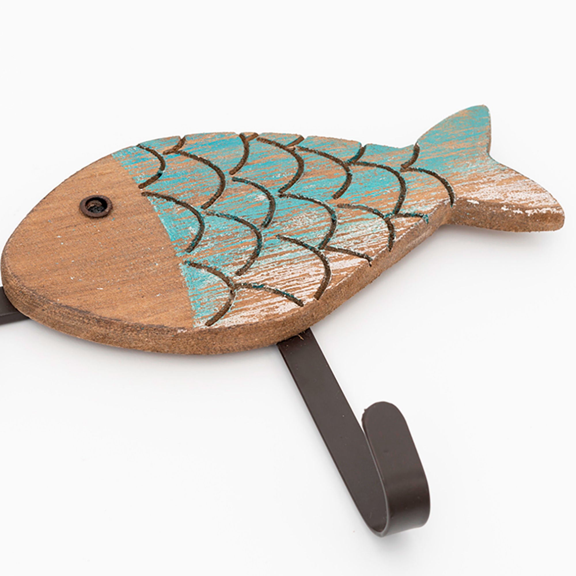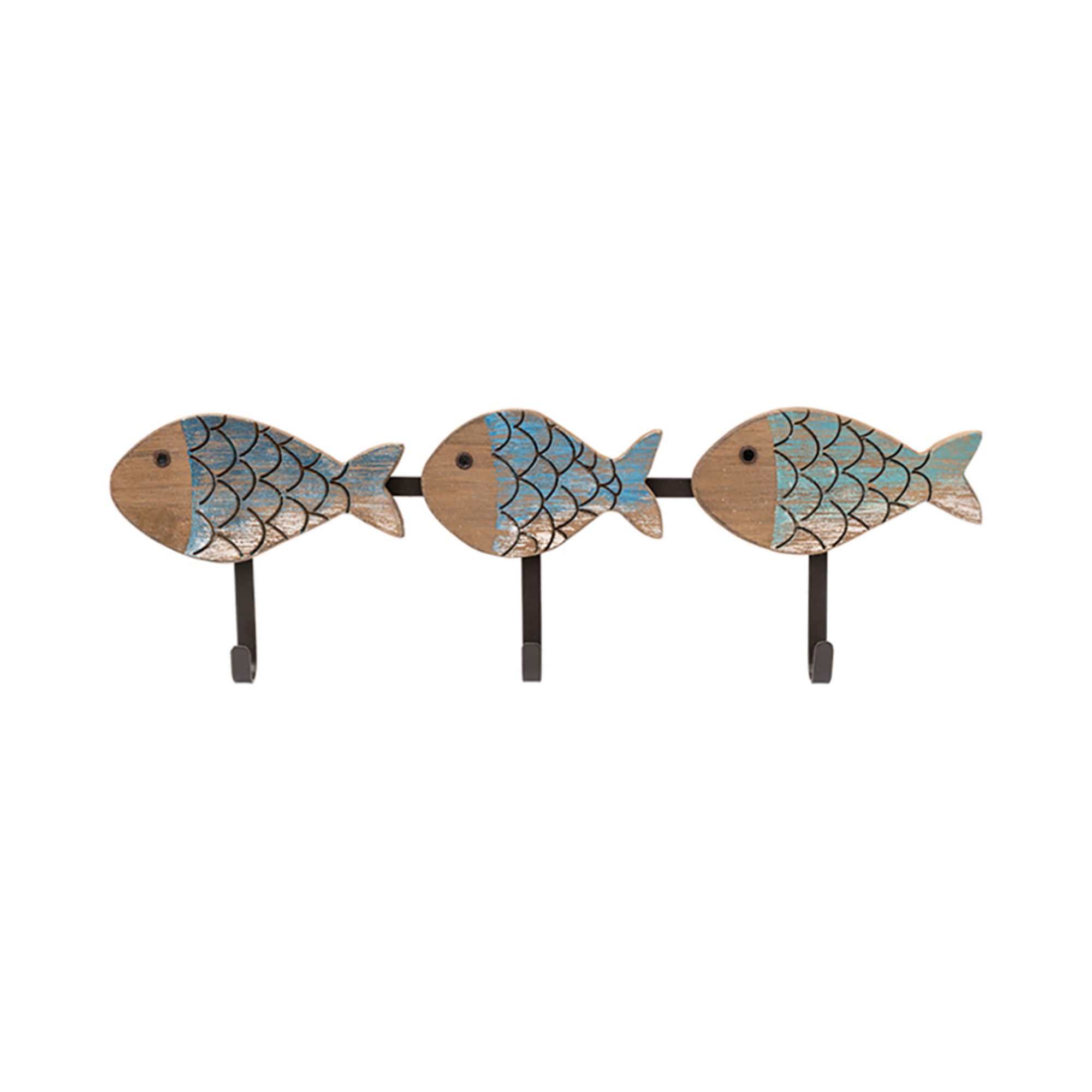 Set of 3 coat hooks, each in the style of a fish, in cheerful colours of a distressed style. Made of wood, with metal hooks.