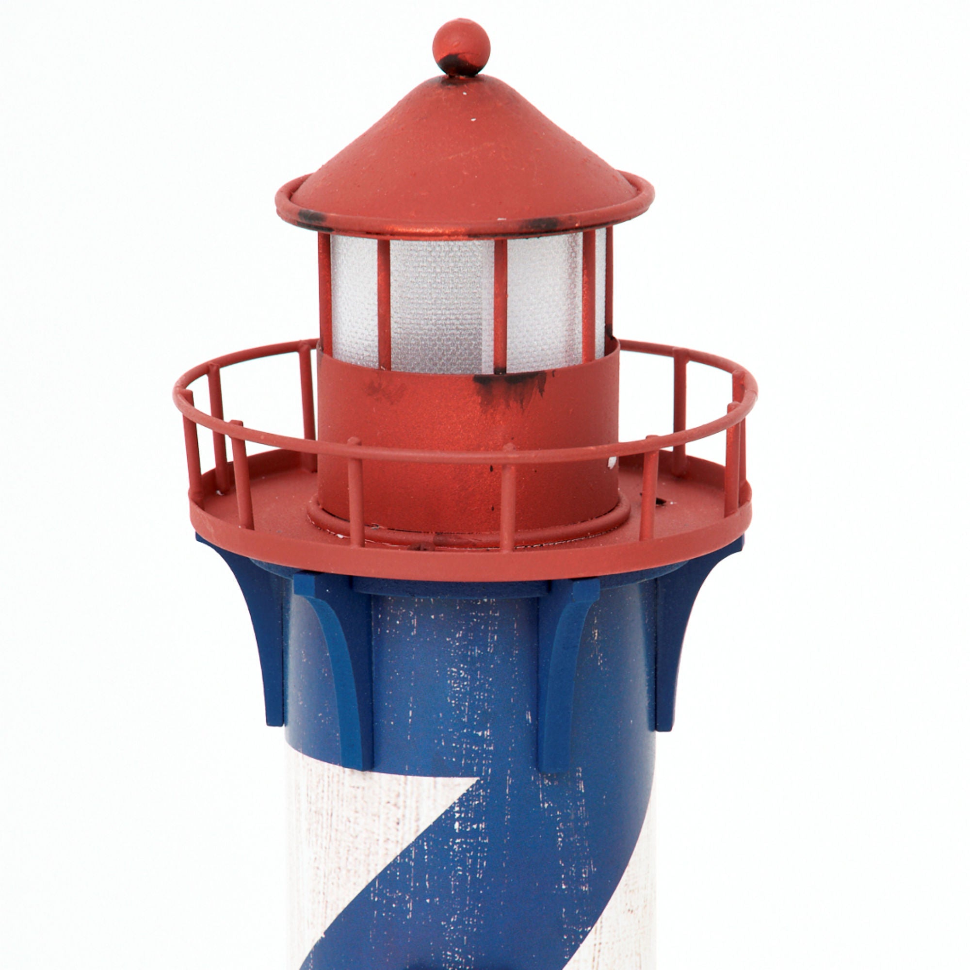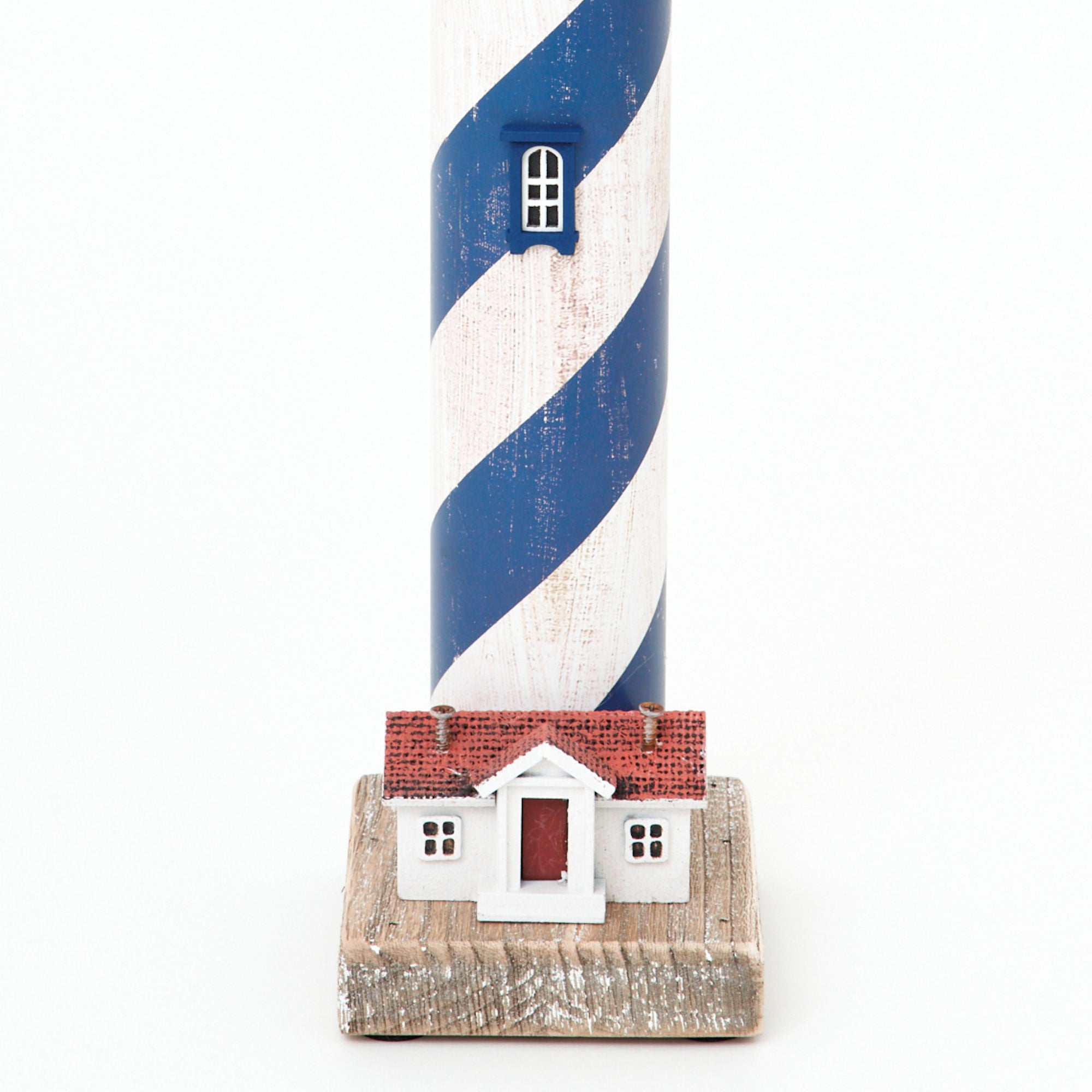 LED illuminated tall lighthouse ornament, made out of resin. Designed to look typical of a white and blue diagonally painted lighthouse. Electric light kit installed with LED bulb requires 2 x AA batteries, (not included).