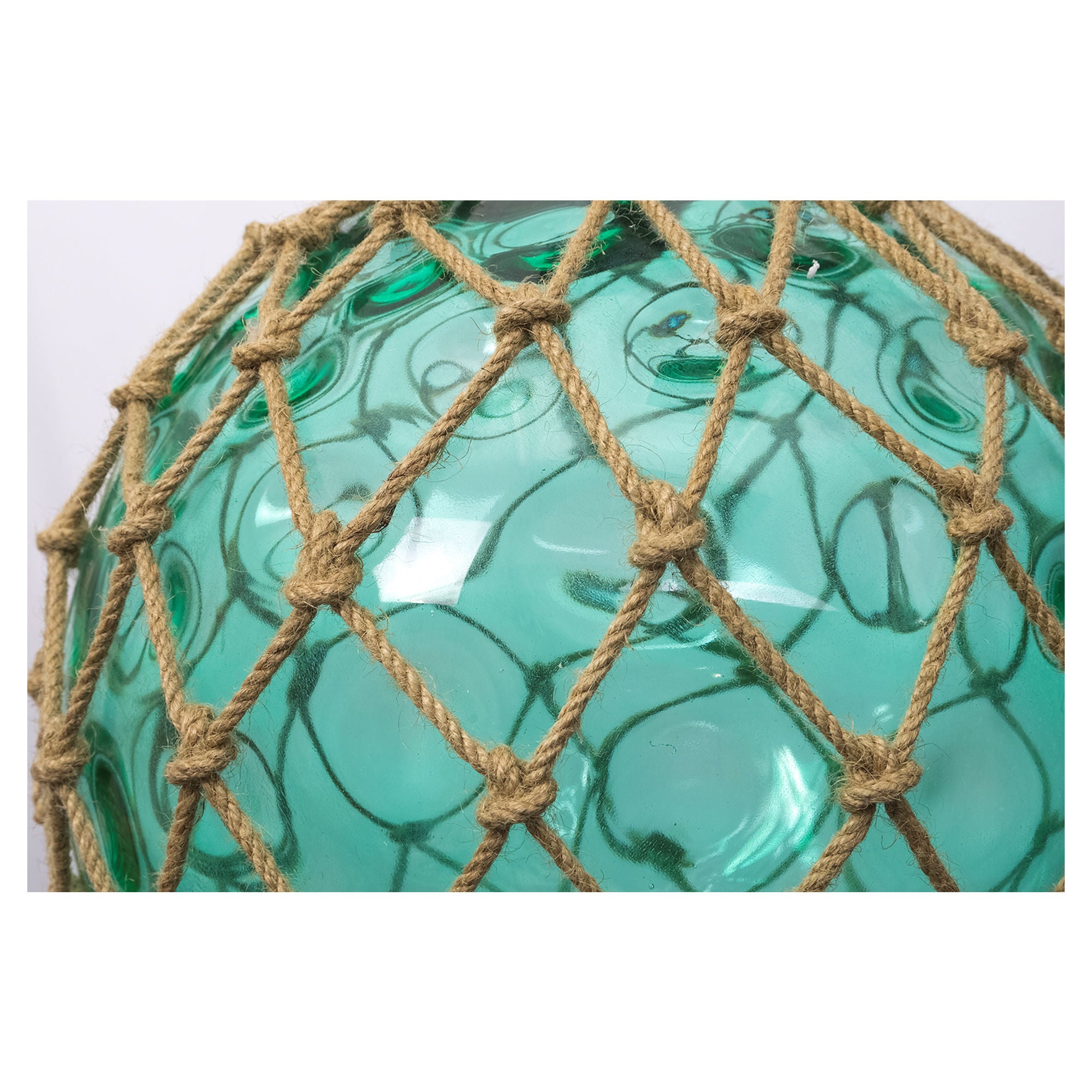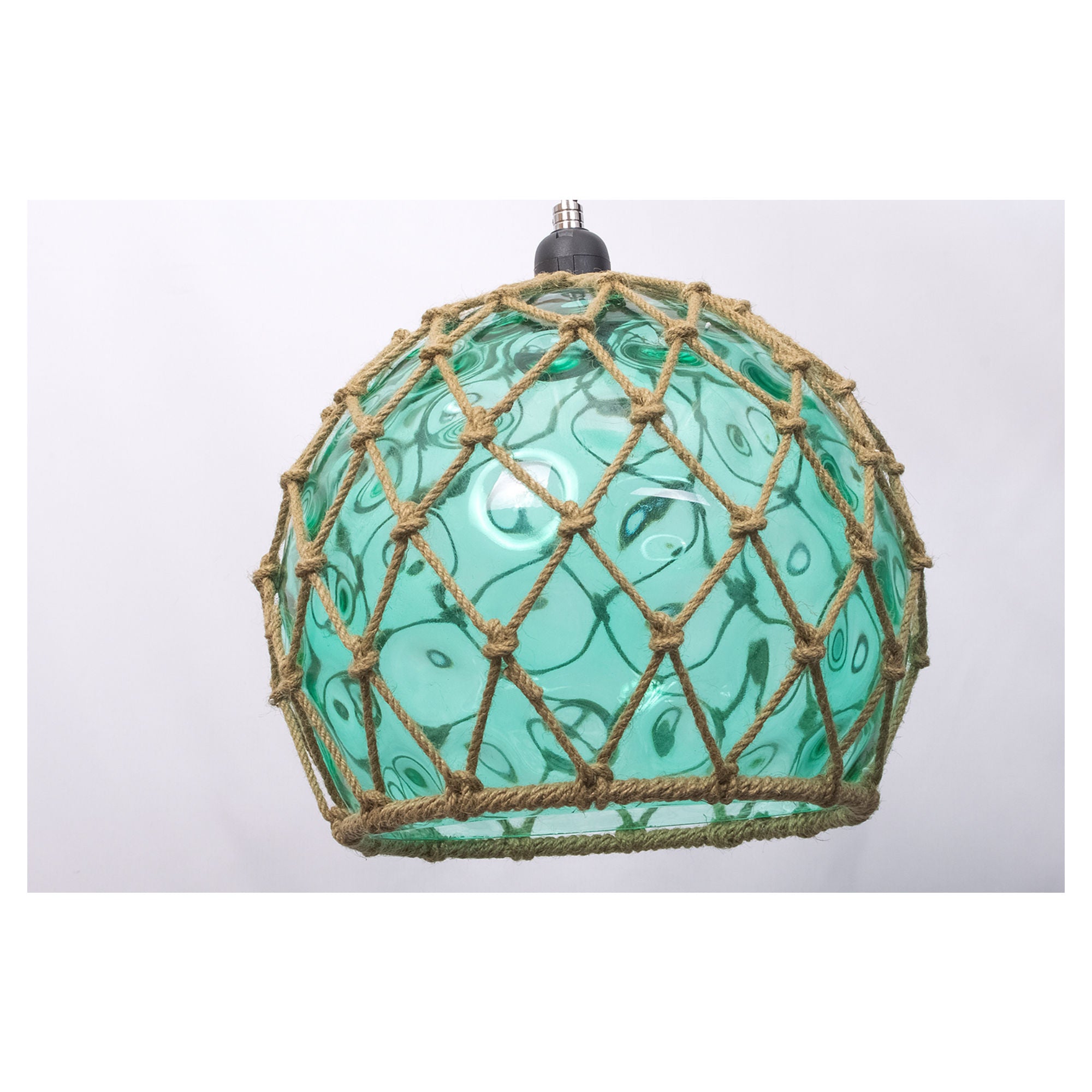 A ceiling lamp, complete with ceiling fittings and rose, in the style of a buoy with genuine rope decoration.Lamp is glass in an green colour.