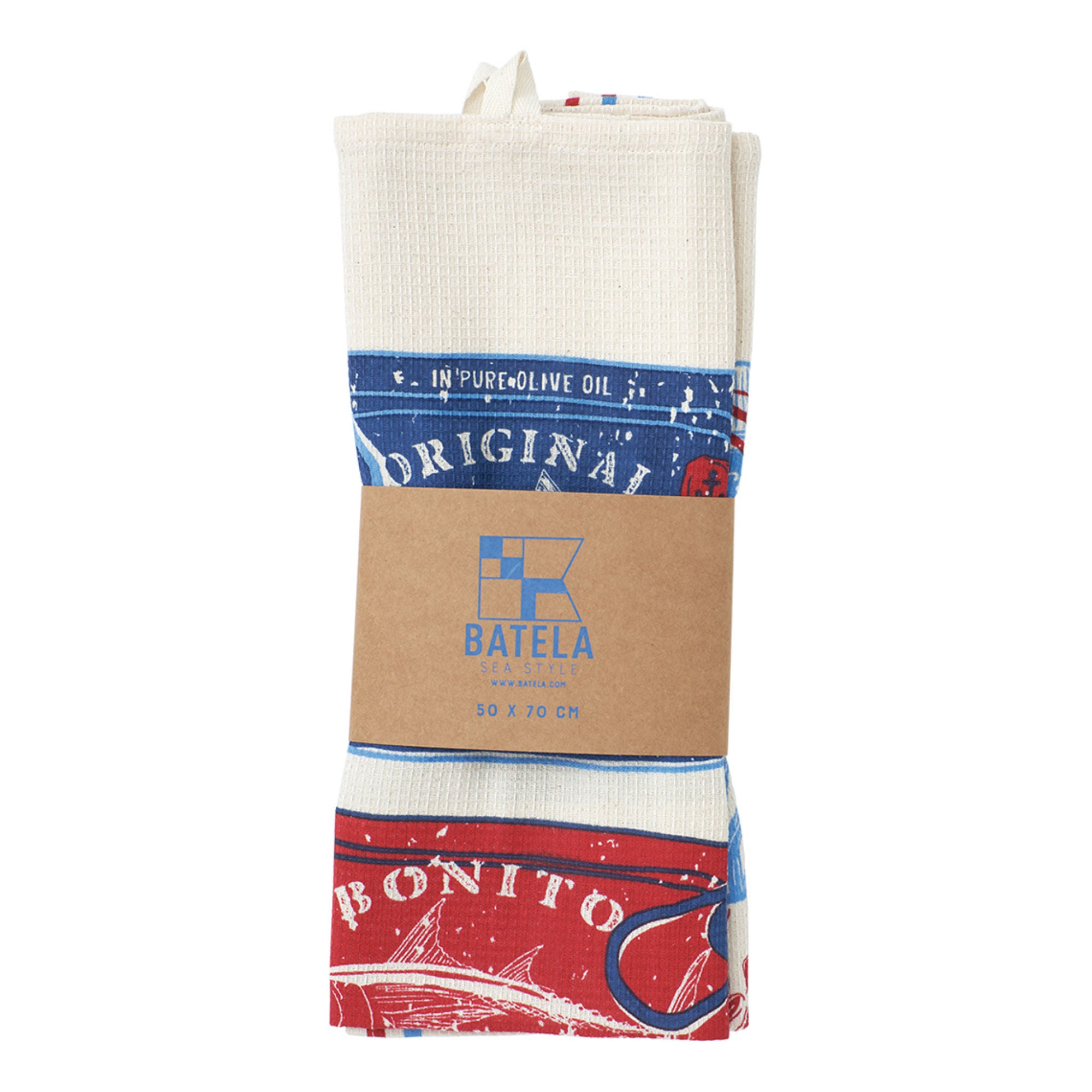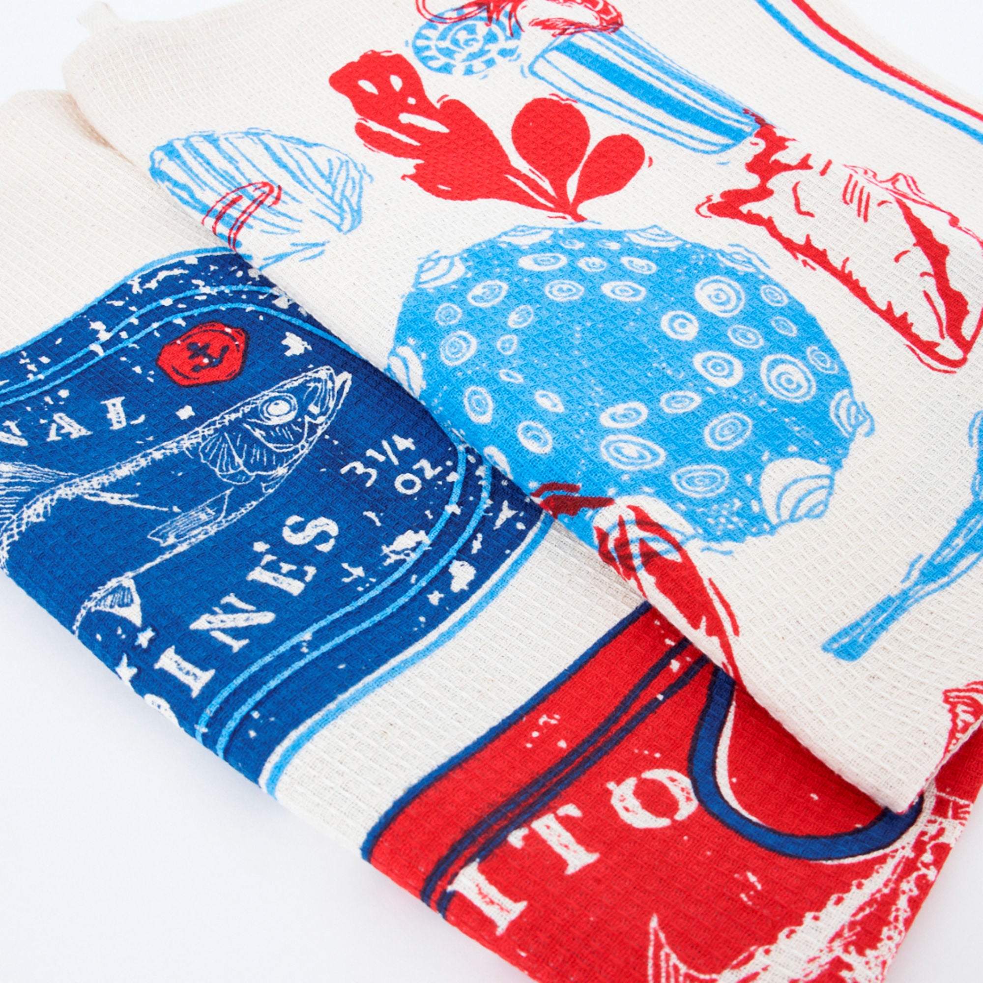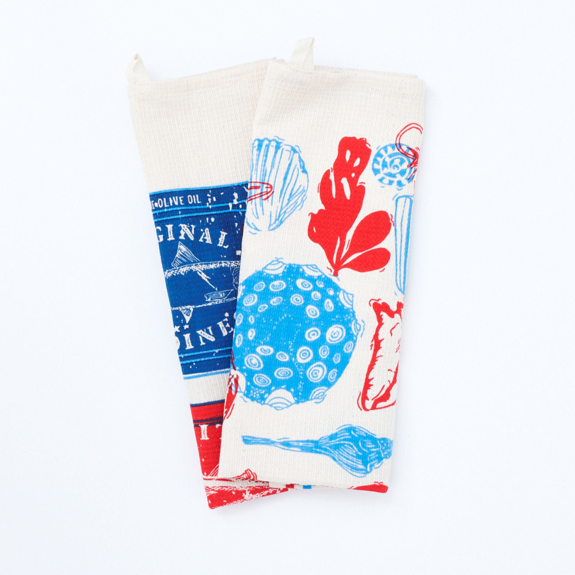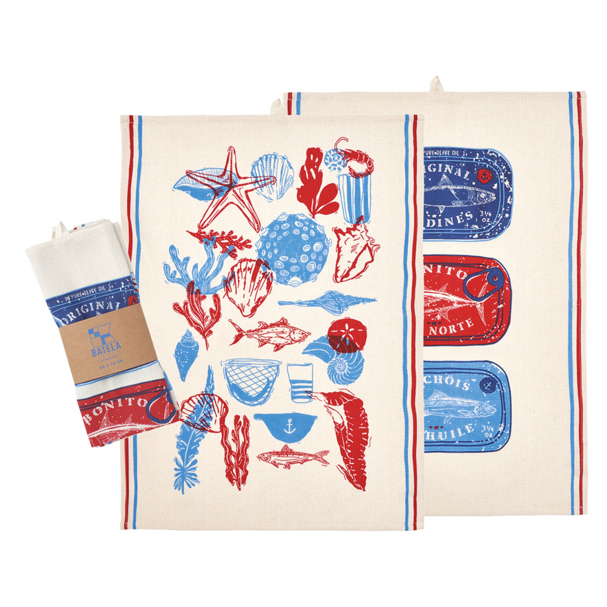Stylish cotton tea towels; one depicting a variety of sea-life images and the other three fish tins, comes complete with gift packaging.