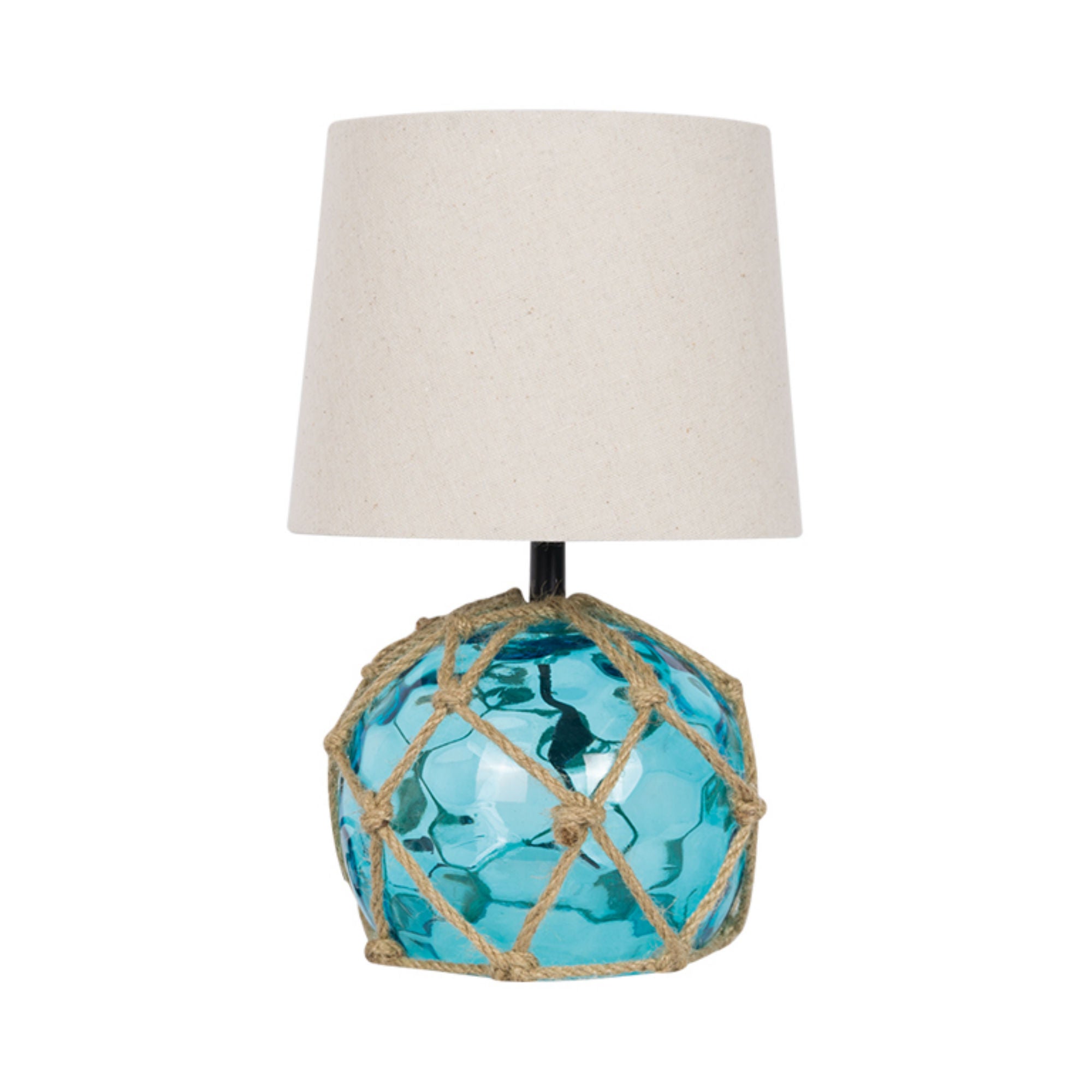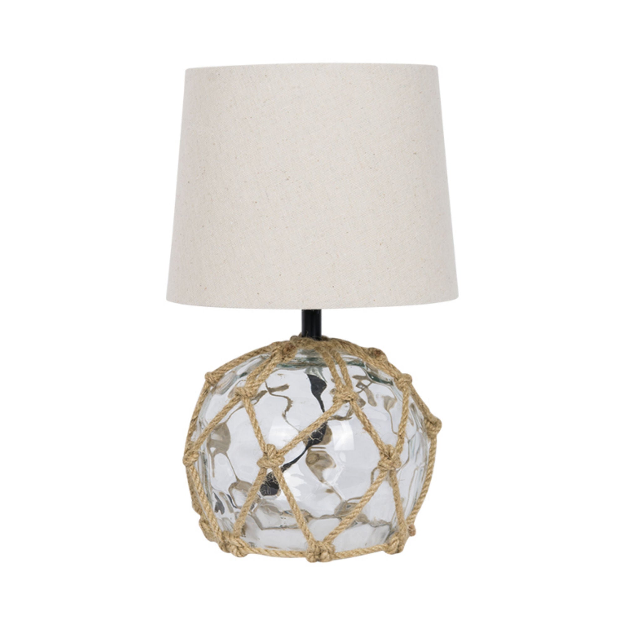 Small table lamp with clear glass base, with rope detailing, designed to look like a nautical buoy. Complete with lamp shade. The smaller size makes this ideal for use as a bedside lamp.