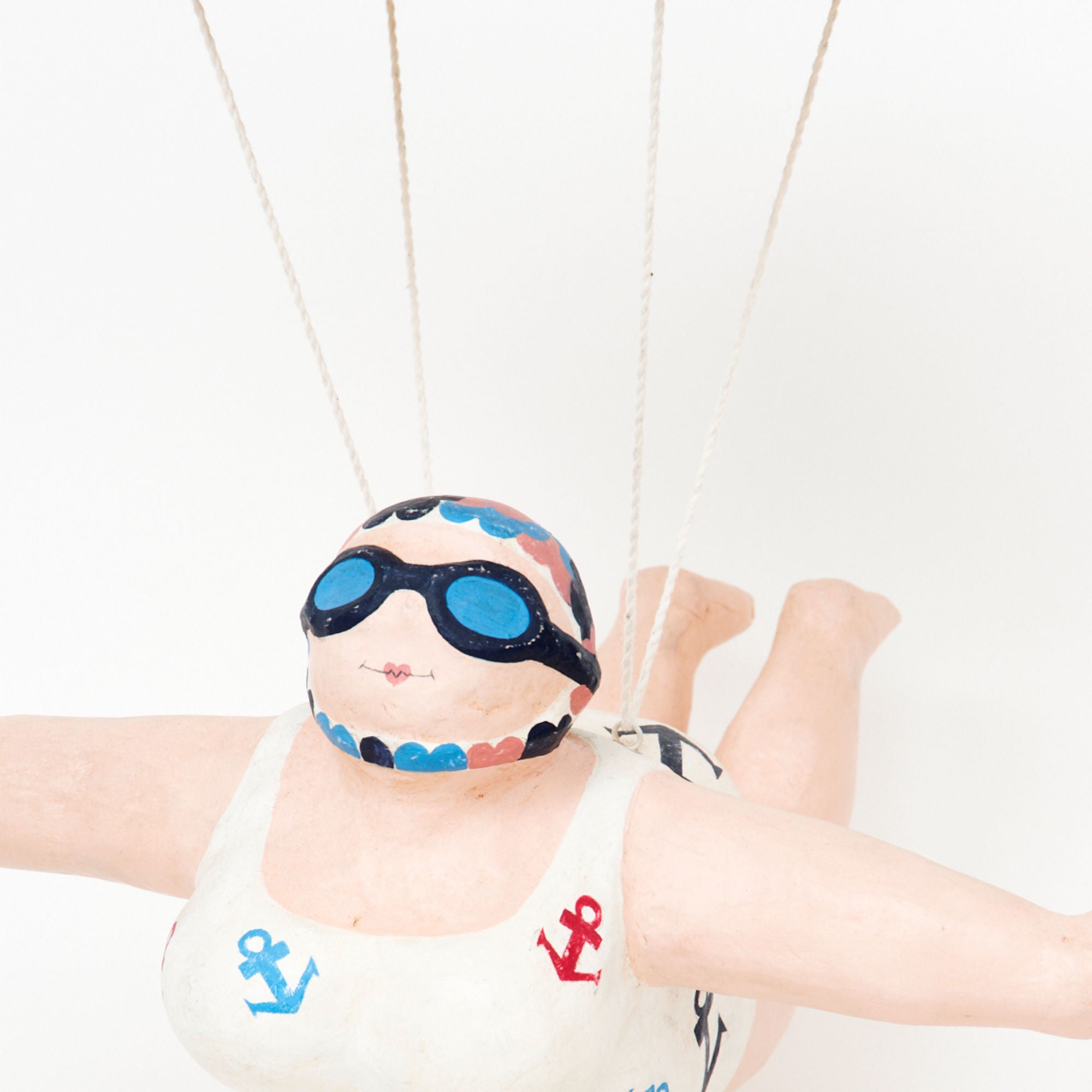 A delightful Papier-mâché 'swimmer' figurine, designed to hang down and suspended from a blue/white parachute.