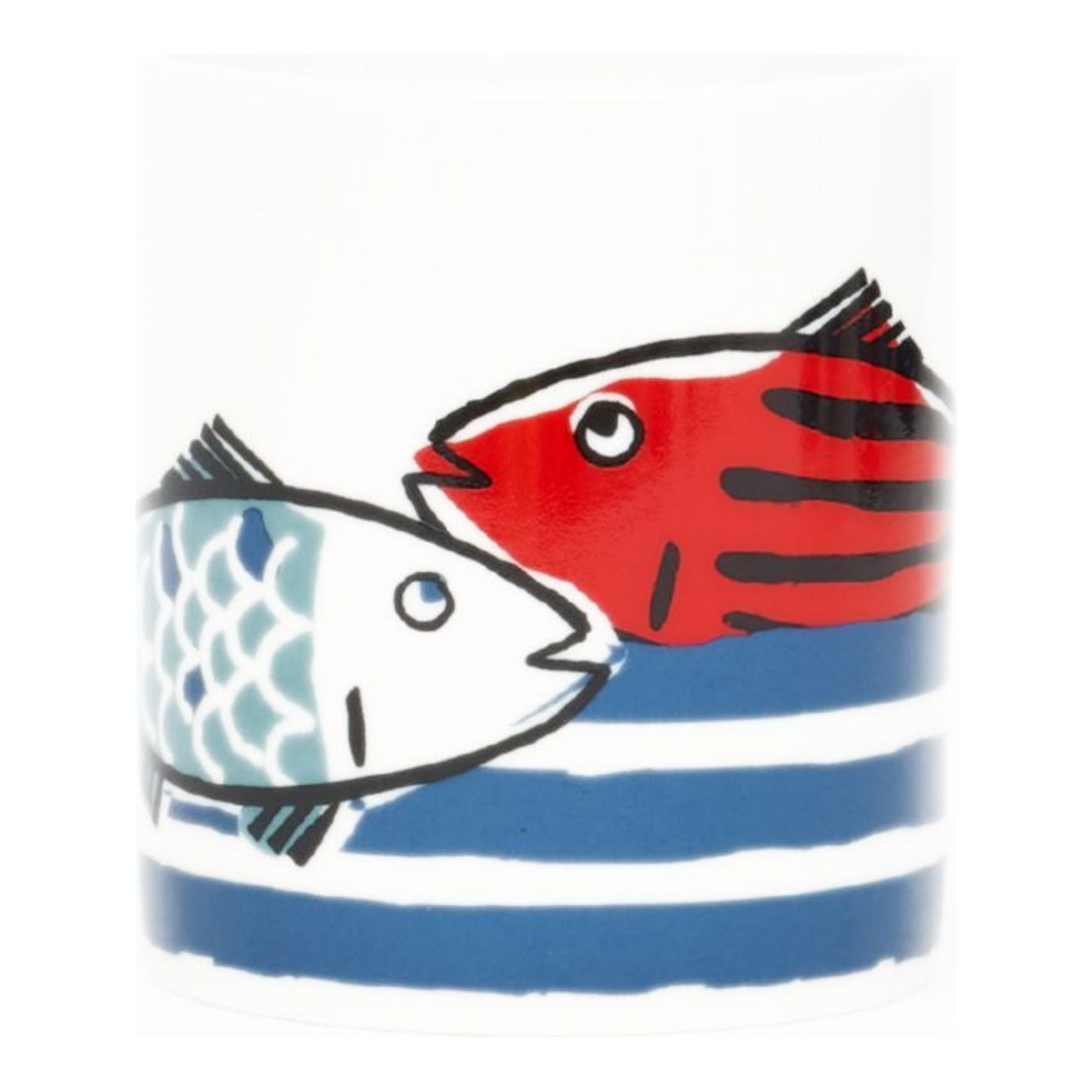 White Ceramic mugs decorated with a blue and red fish design.