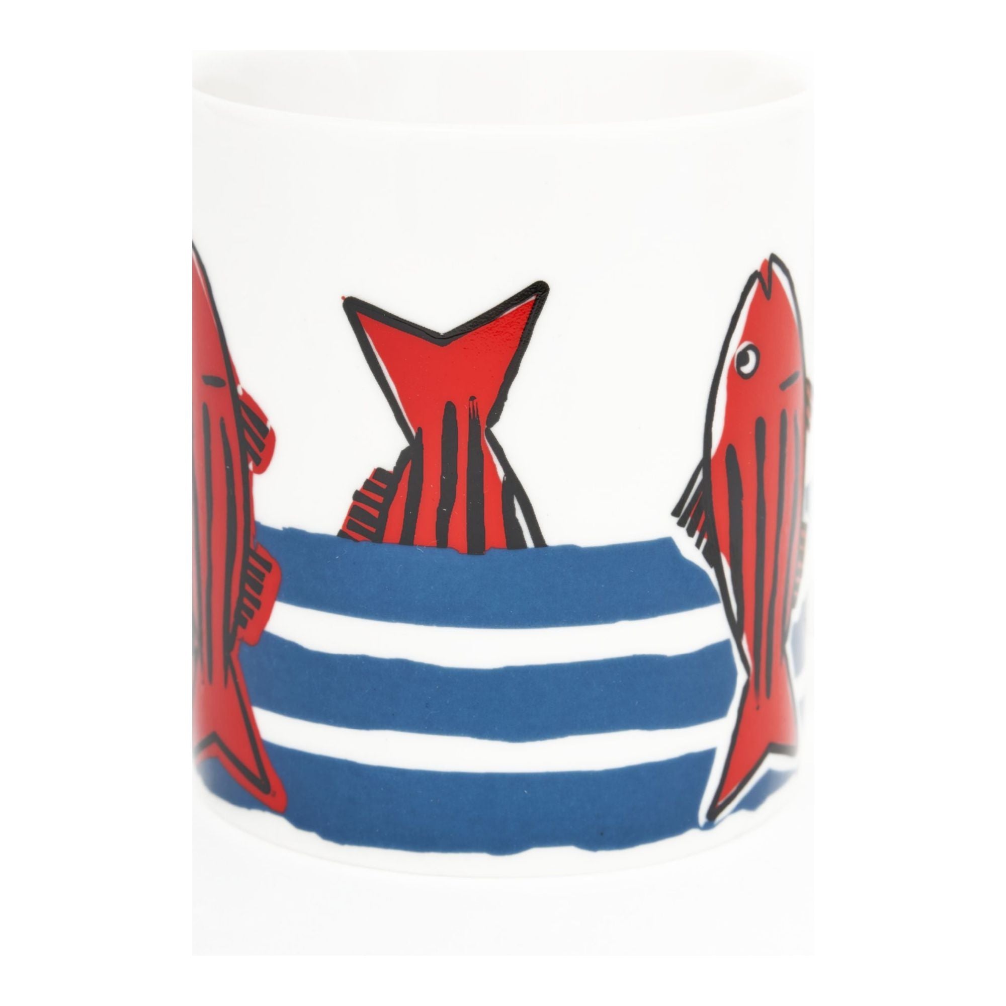 White Ceramic mugs decorated with a two red fishes and blue/white stripes 'sea' design.