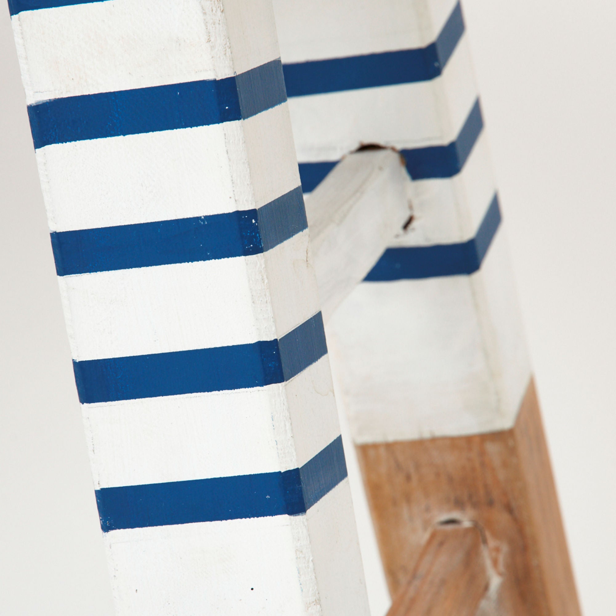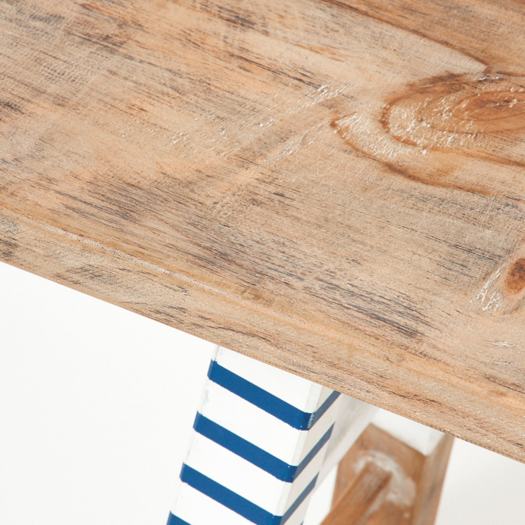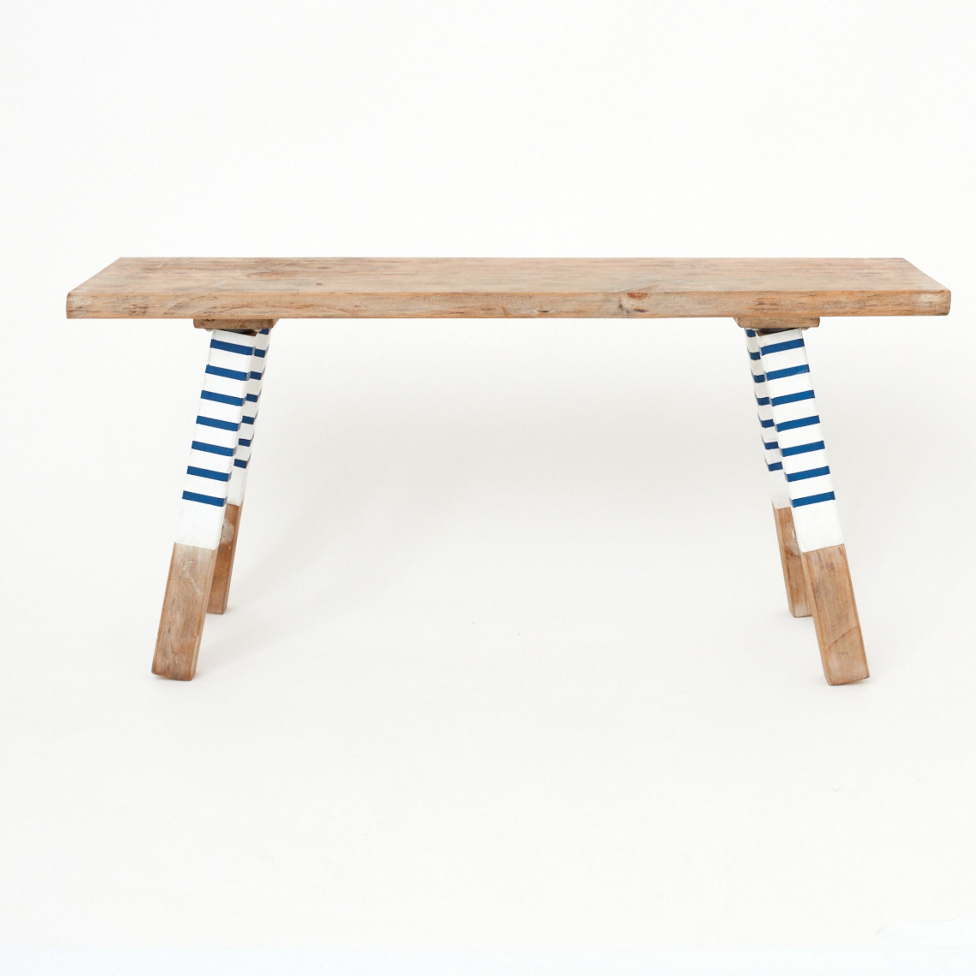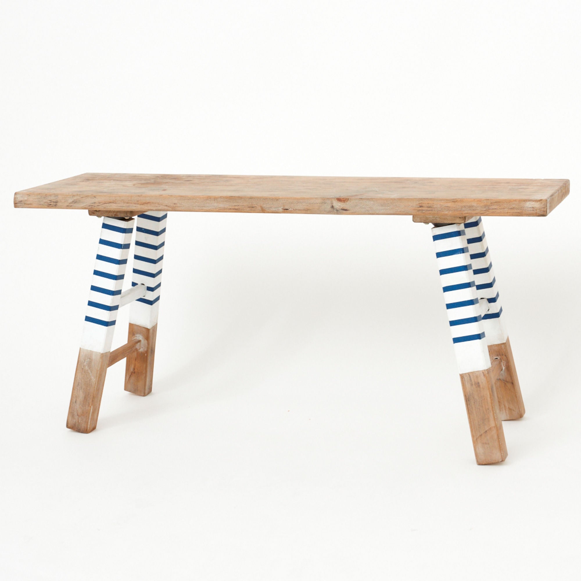 Wooden bench with blue and white nautically styled detailing on the legs, to add a touch of the sea to your home.