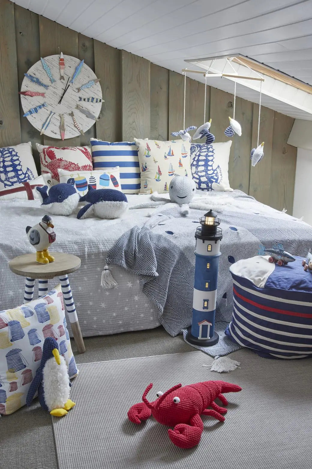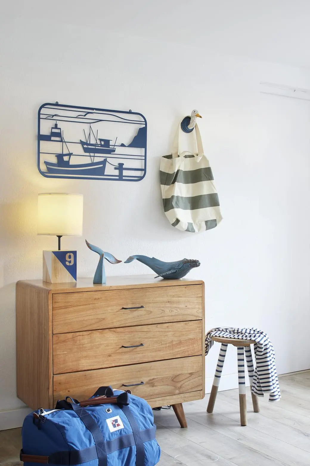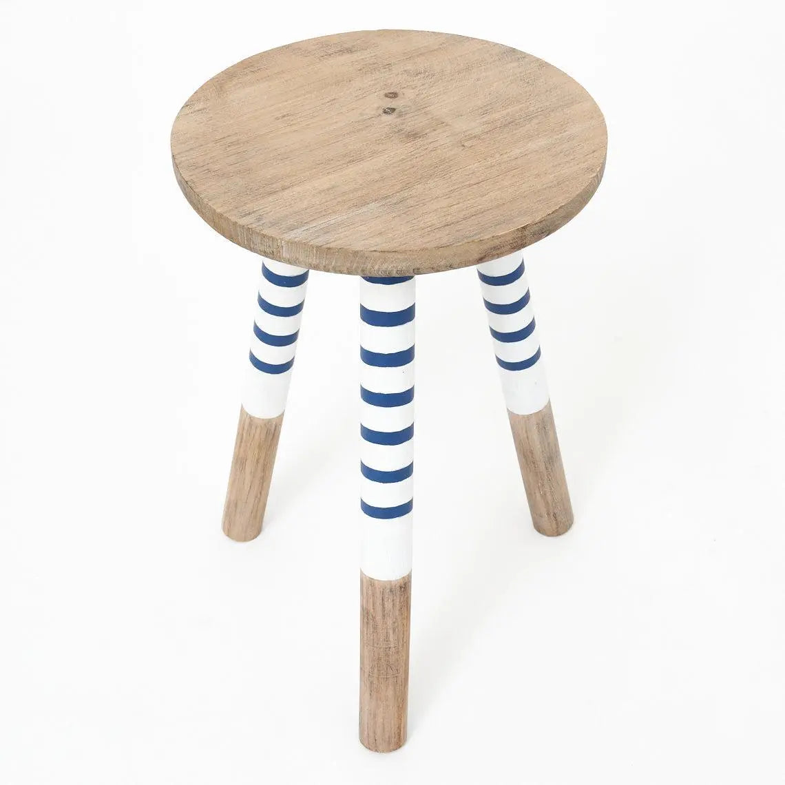 Wooden three-legged stool with blue and white nautically styled enamel detailing on each leg, to add a touch of the sea to your home. (See also Bench Product Code D2151)