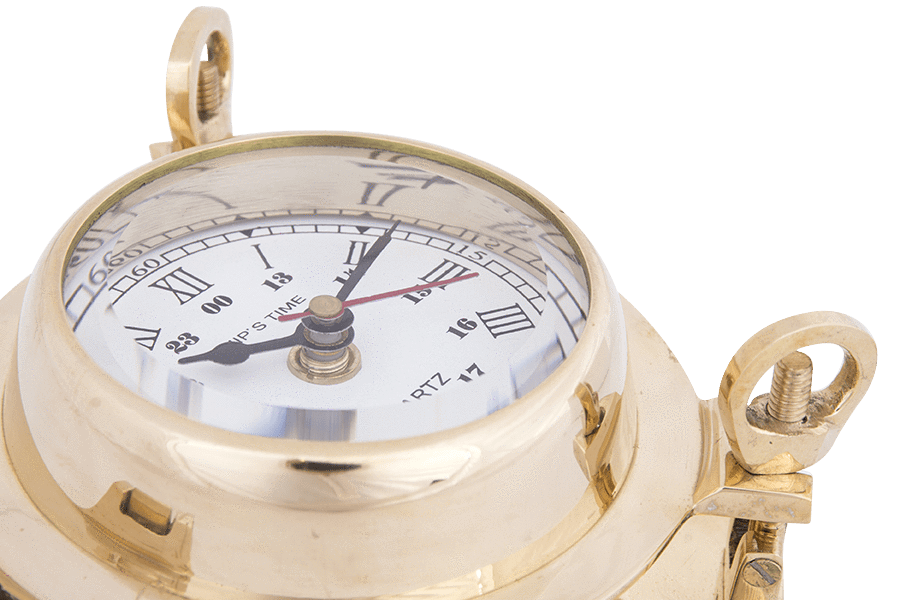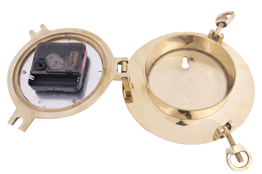Porthole clock made of solid brass with battery powered mechanism. Requires one AA battery.