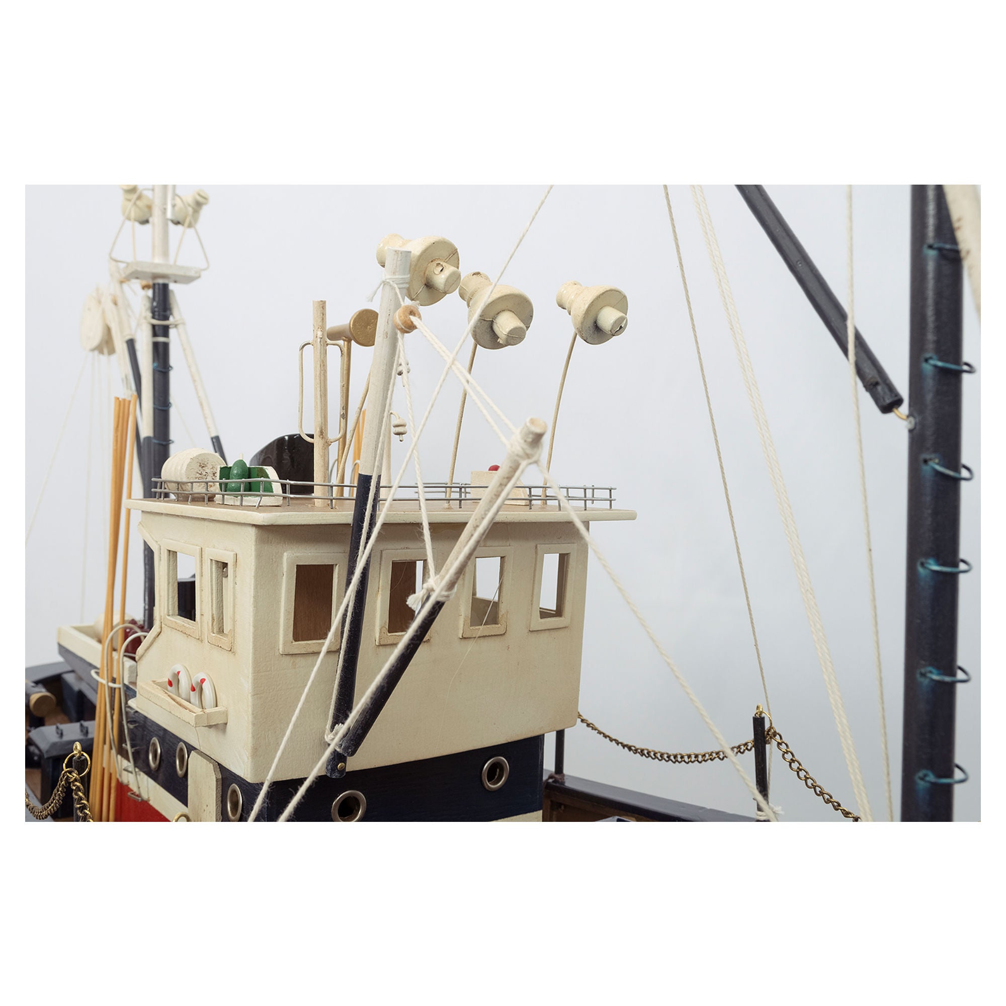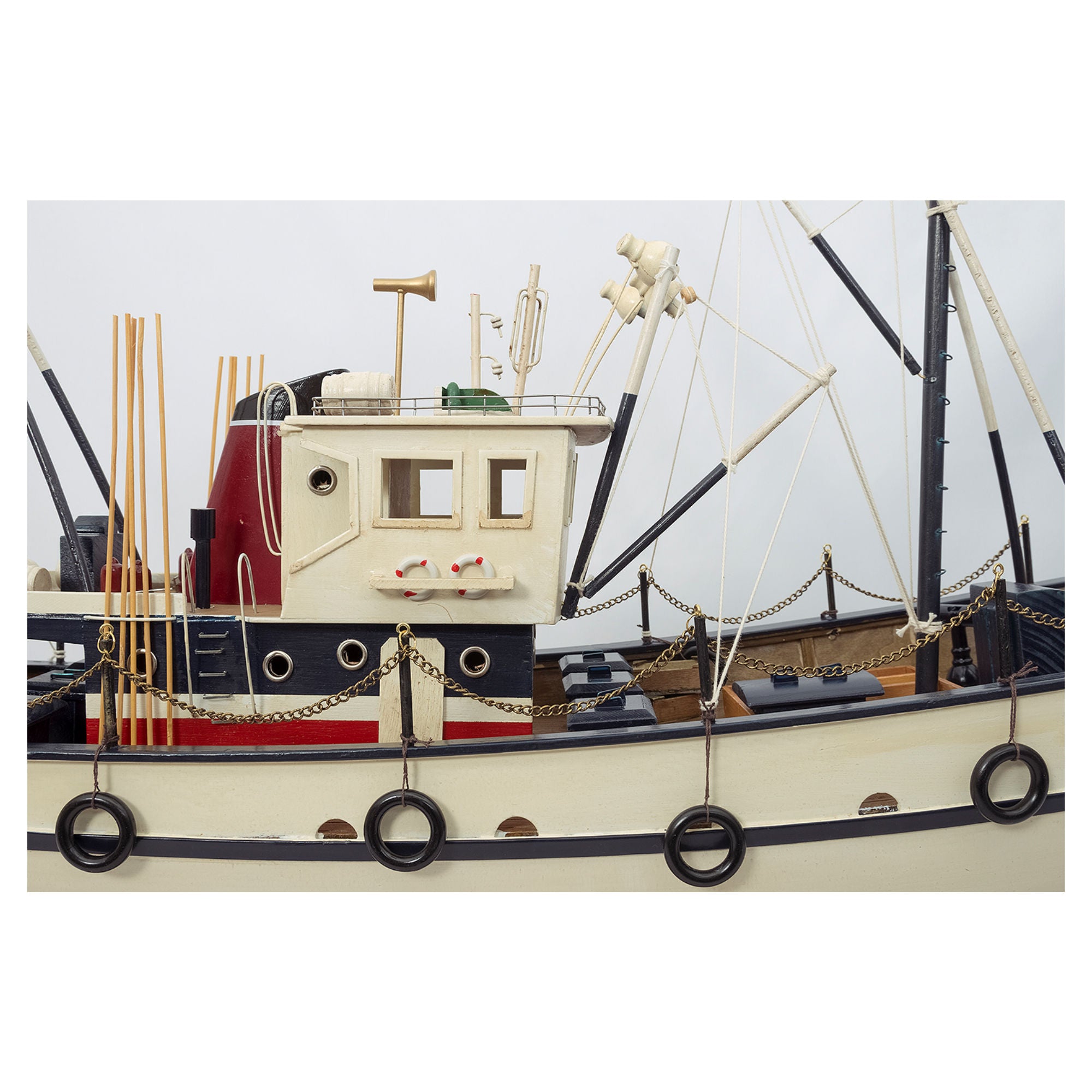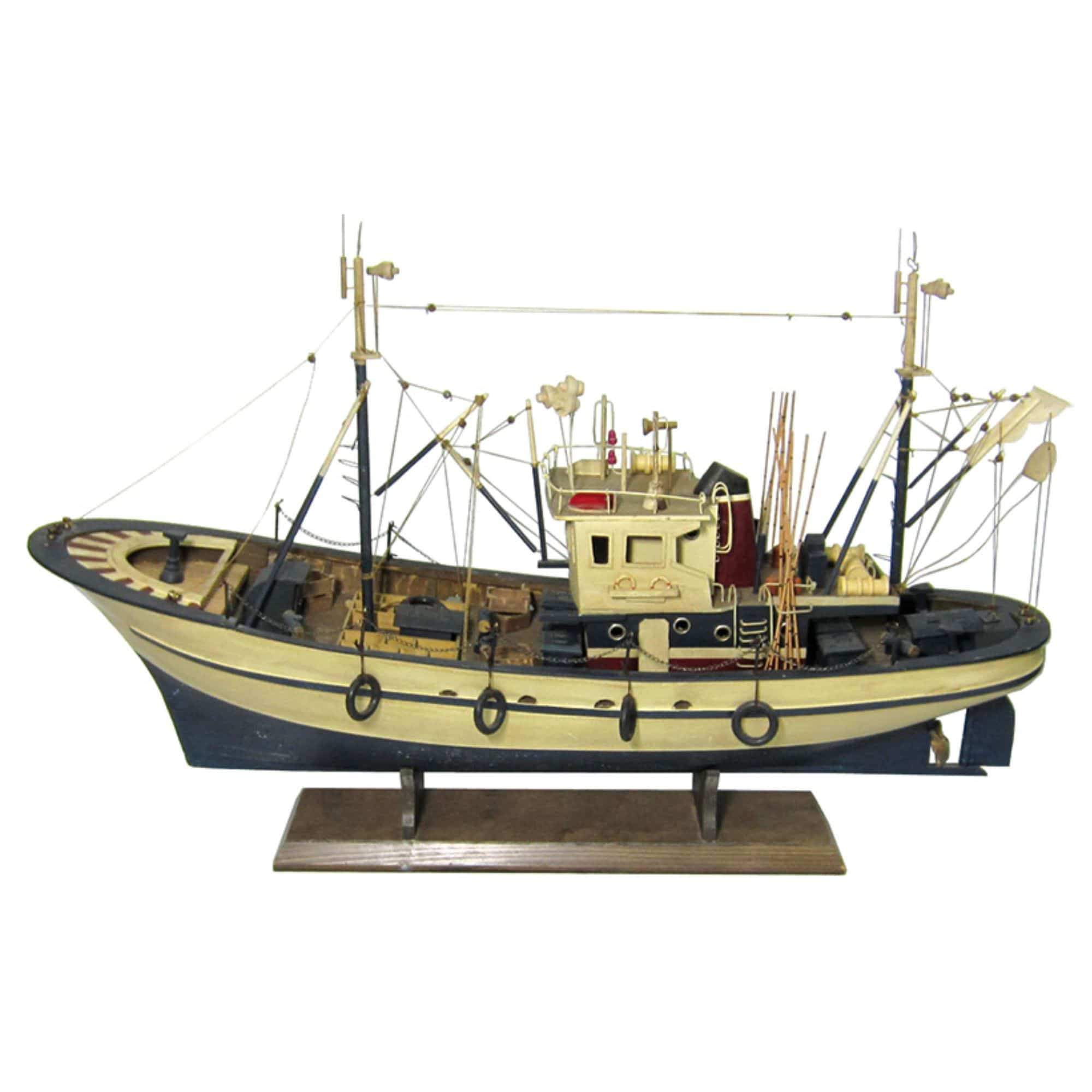 A replica model fishing boat from the seafood fishing industry. Made from wood.