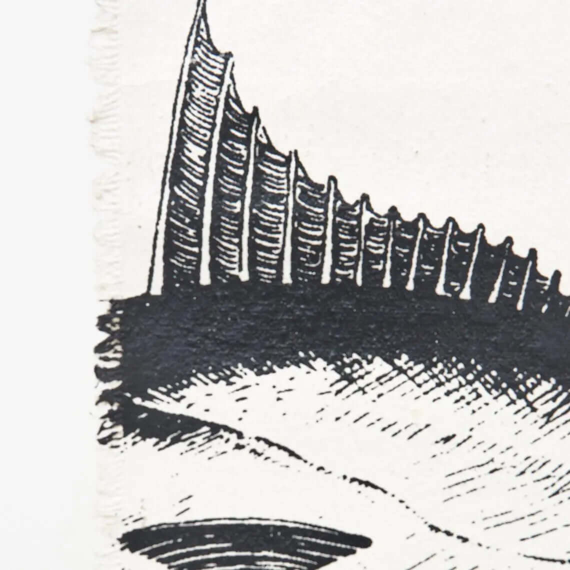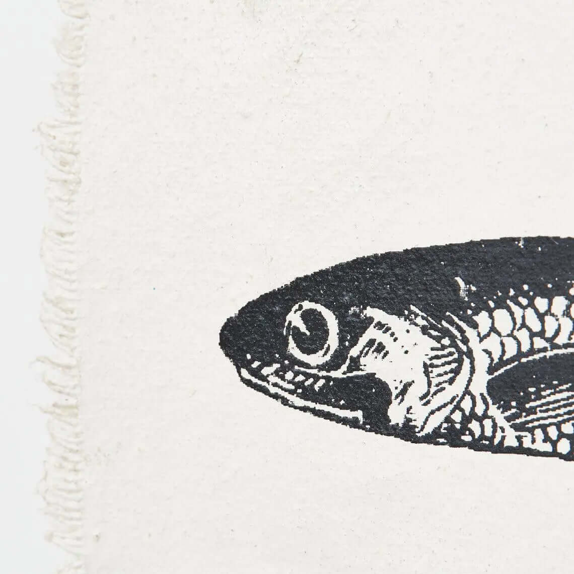 An unusual Sea-Style cotton/canvas wall hanging with wooden hangers top and bottom depicting different Japanese-style black/white pictures of Tuna fish.