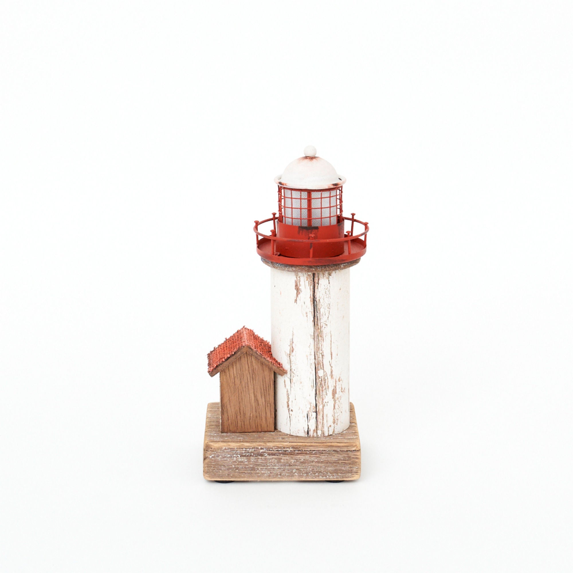 LED illuminated lighthouse ornament, made out of wood. Designed to look typical of a lighthouse built alongside a lighthouseman's house.